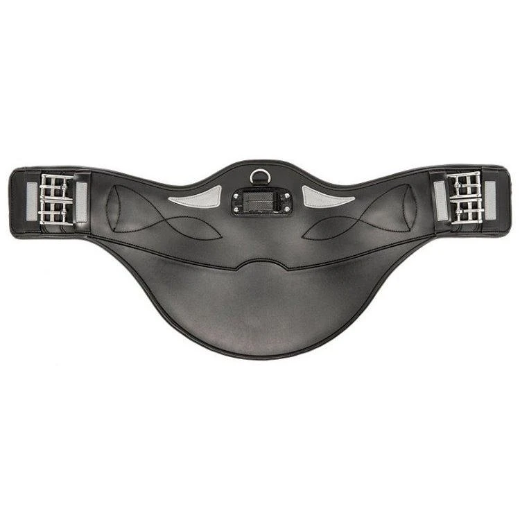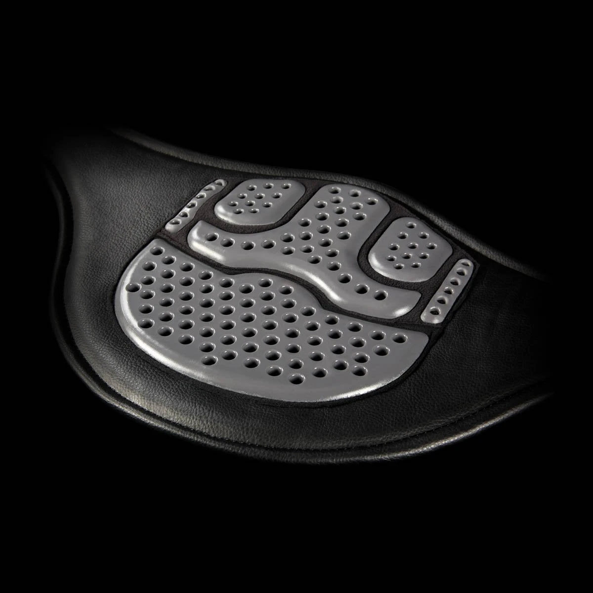 A more streamline version of the Stud Girth contoured to fit round the elbow and maximise freedom of movement. This comfort girth is made from composite material & soft eco leather. Eliminates pinching & relieves pressure on the abdomen enabling a tight close fitting girth without discomfort. A sophisticated airflow pattern is created by the individual shock absorbing gel pad elements. This improves flexion, breathability and reduces sweat build up. A patented Acavallo® safety fastening hook is designed to eliminate need for additional snap hooks for martingales & draw reins creating a smooth safe connection