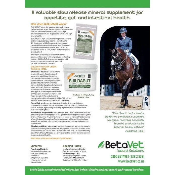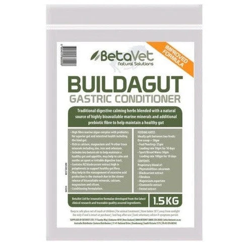 The ideal combination to improve the digestive tract and feed efficiency. A supplement for all horses and ponies that supports the health and balance of the stomach and hind gut. For digestive health, traditional herbs and natural minerals are used. Benefits of BUILDAGUT Due to its high calcium content and unique sponge-like structure, BUILDAGUT is beneficial for maintaining stomach health.