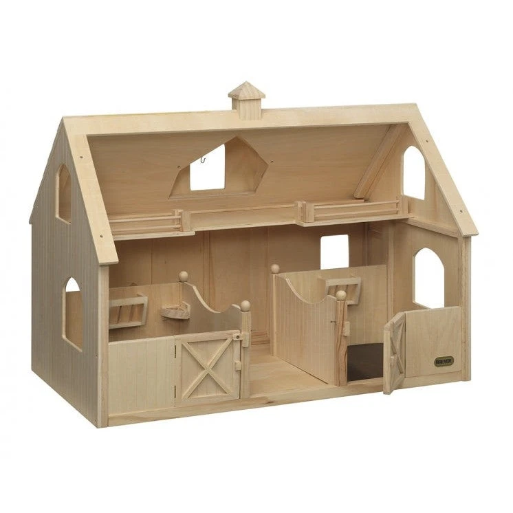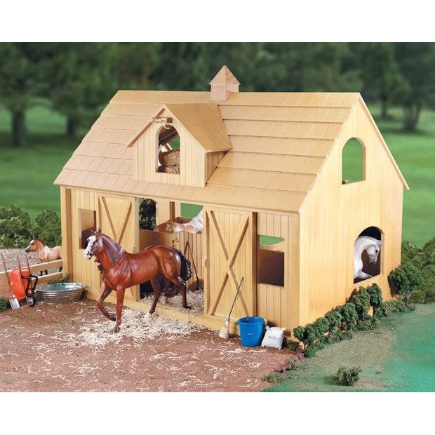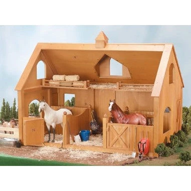 Constructed from high-quality natural wood, this stable boasts durability and authenticity. Its assembled dimensions are 30.5 inches in length, 21 inches in height, and 18.5 inches in depth, making it the ideal size for your Traditional Series horses. Please note that assembly is required.