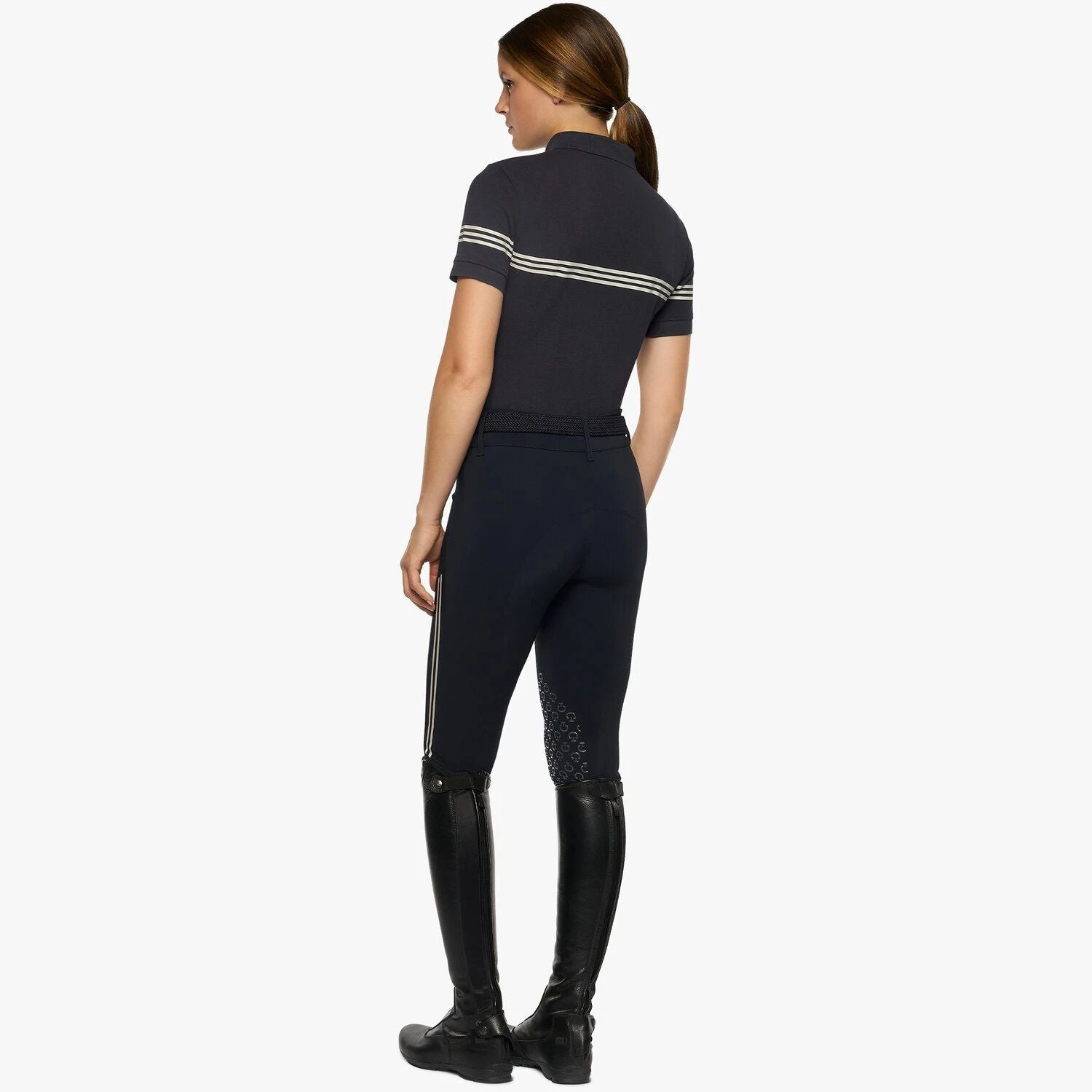 Sporty style and Cavalleria Toscana elegance come together in this casual polo shirt for women. In piqué knit cotton that’s light and comfortable even during intense training sessions, it’s a delight to wear and can easily be styled with the breeches and jackets in the new collection. The classic cut, polo collar, and short sleeves are updated with stripes and ‘Cavalleria Toscana’ printed on the chest.