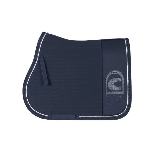 Equipped with horizontal stripe quilting on the front. The back of the saddle pad is equipped with a vertical smooth strip with a silver Cavallo glitter logo made of small nailheads. The saddle pad is bordered with two cords of different widths.