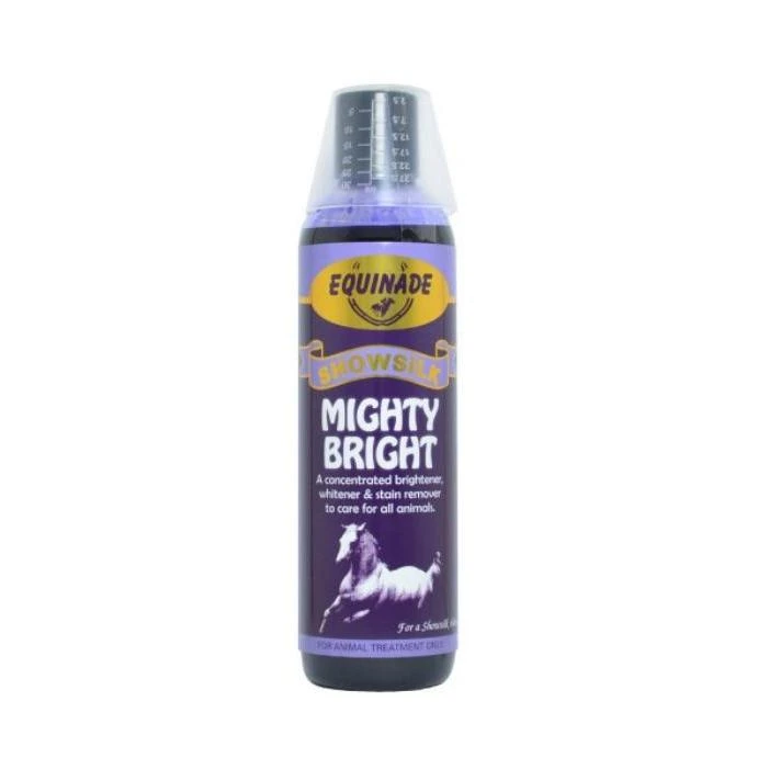 Introducing The Equinade Showsilk Mighty Bright. The Equinade Showsilk Mighty Bright is an amazing rinse that brightens, whitens and removes stains from animals coats and tails and horses manes.