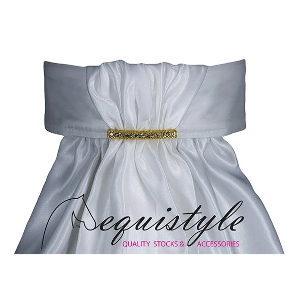 The Luxure stock design is available in white satin with a silver, rose gold, gold, black, red, royal blue or AB (for a little extra sparkle) crystal set bar adornment.