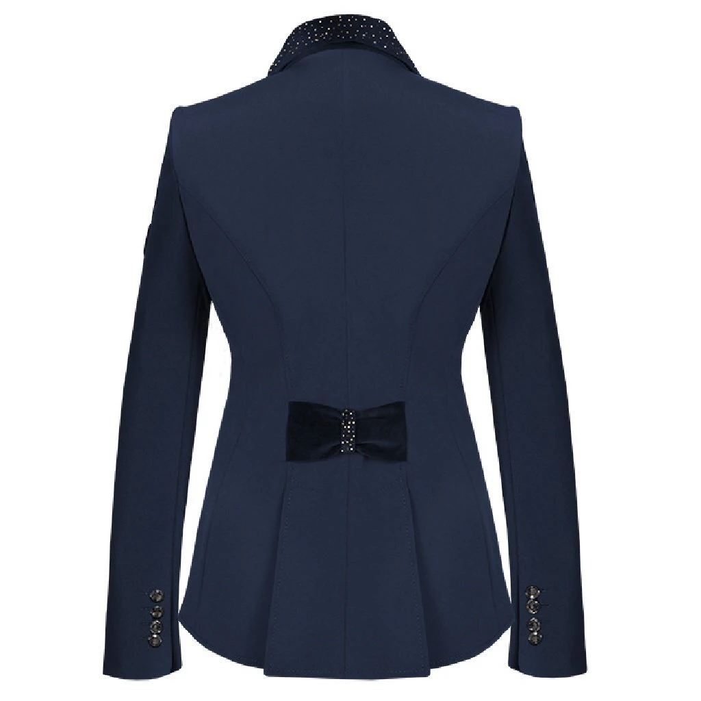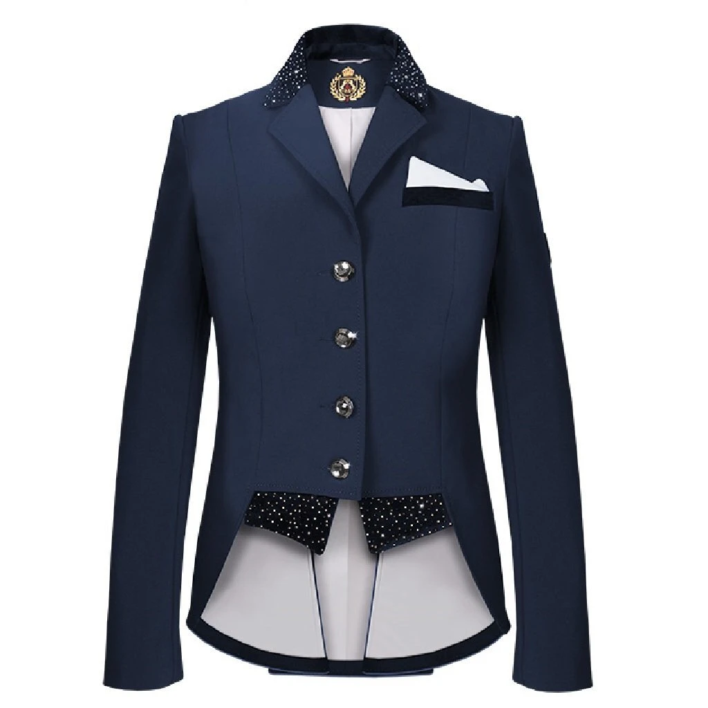 Very chic, short dressage mini tails, ideal for competition with young horses. Made of a thin, elastic and water resistant softshell fabric and featuring a velour collar studded with decorative rhinestones, and matching bow detail on the back.