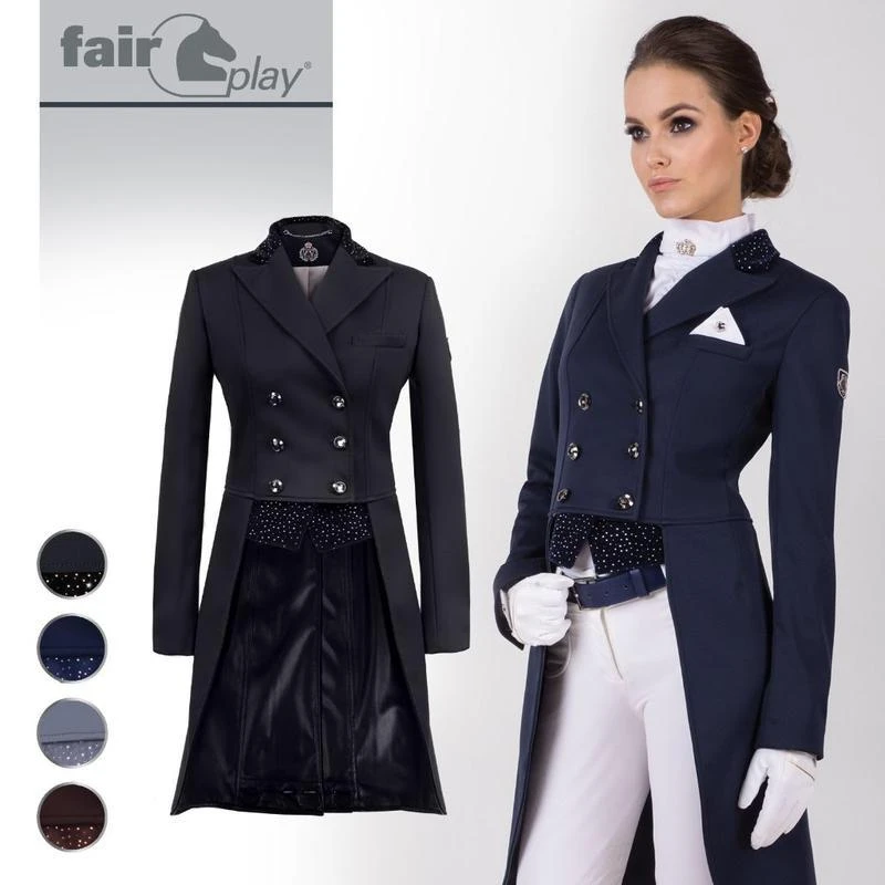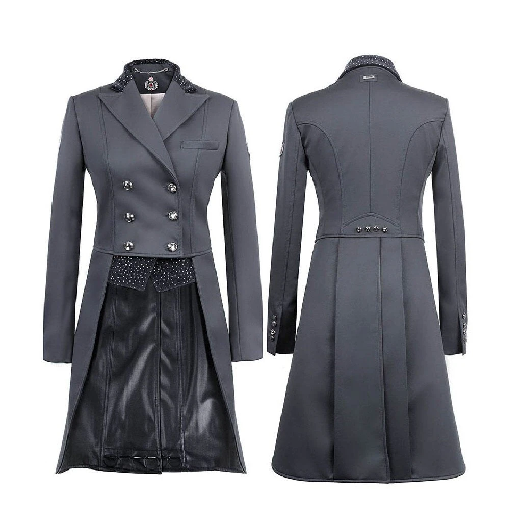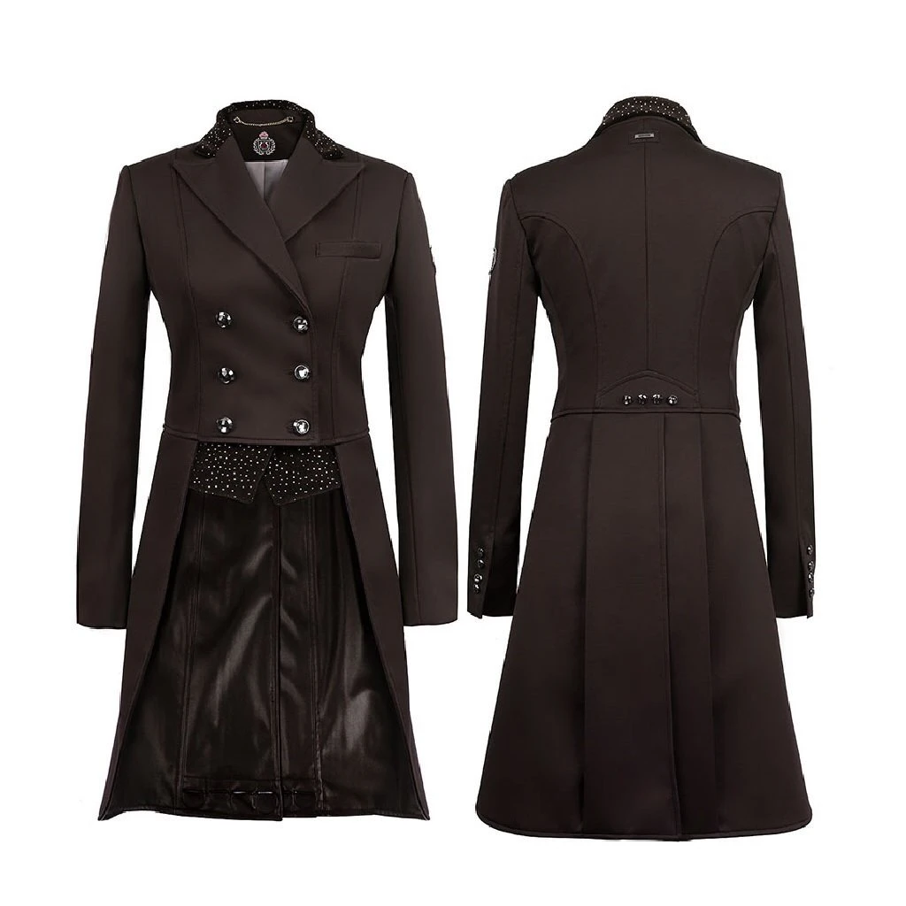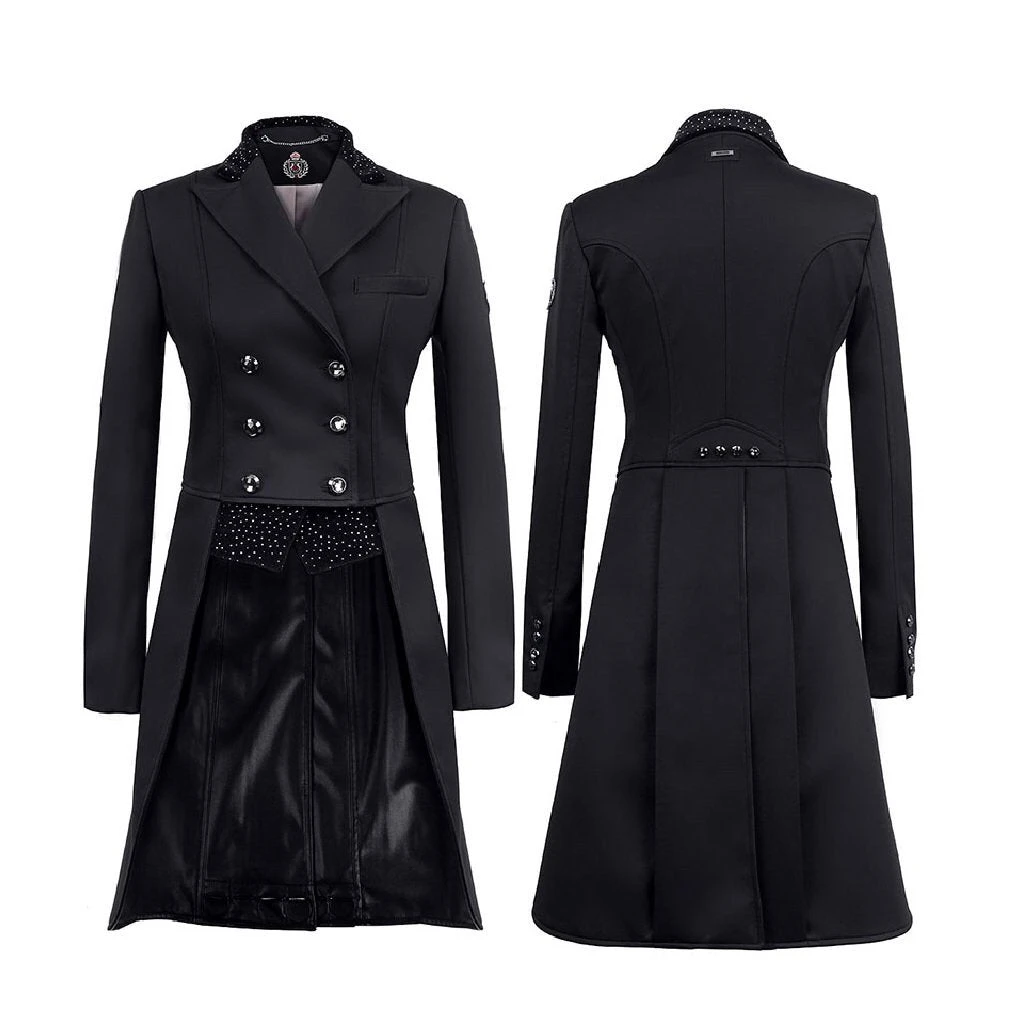 Very elegant, high quality dressage tailcoat. Made of a thin, elastic and water resistant softshell fabric and featuring a velour collar studded with decorative rhinestones, and decorative crystal button detail on the back. Tails are lined with faux leather for easy cleaning, and weighted with removable discs.