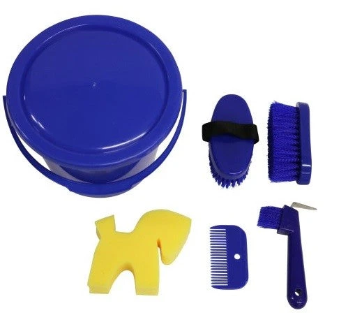 Includes a small body brush, a dandy brush, a curry comb, a hoof pick, a sponge, and a mane comb in a child’s size.