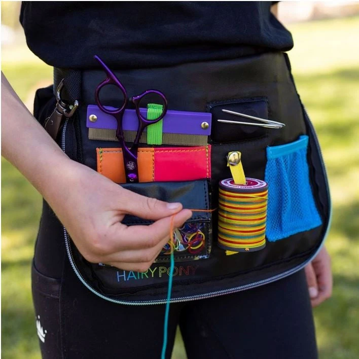 The HAIRY PONY PLAITING APRON is equipped with pockets, magnets, tools, clips, and zips.