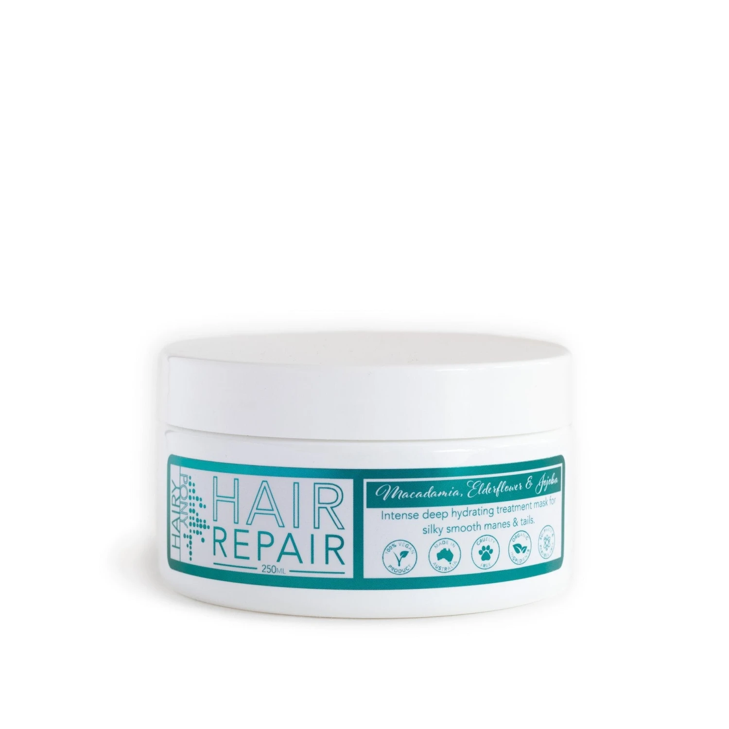HAIRY PONY HAIR REPAIR is formulated for dehydrated, under-nourished, and damaged hair. It contains Hydrolysed Quinoa, Argan Oil, Macadamia, Elderflower and Jojoba to deeply moisturise and nourish manes and tails naturally.Â