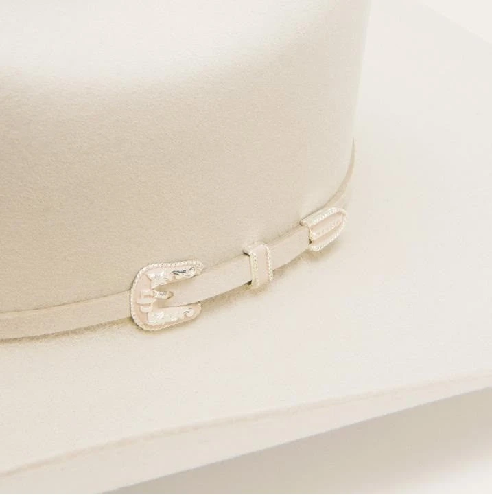 It’s made in the United States of America from 6X fur felt and has the iconic cattleman crease. It’s a staple of Western style. The understated three-piece, hand-painted-over silver-tone buckle adds just the right touch of practical elegance to the subtle self-matching hatband. The brown leather sweatband and satin liner ensure a secure fit and superior comfort.