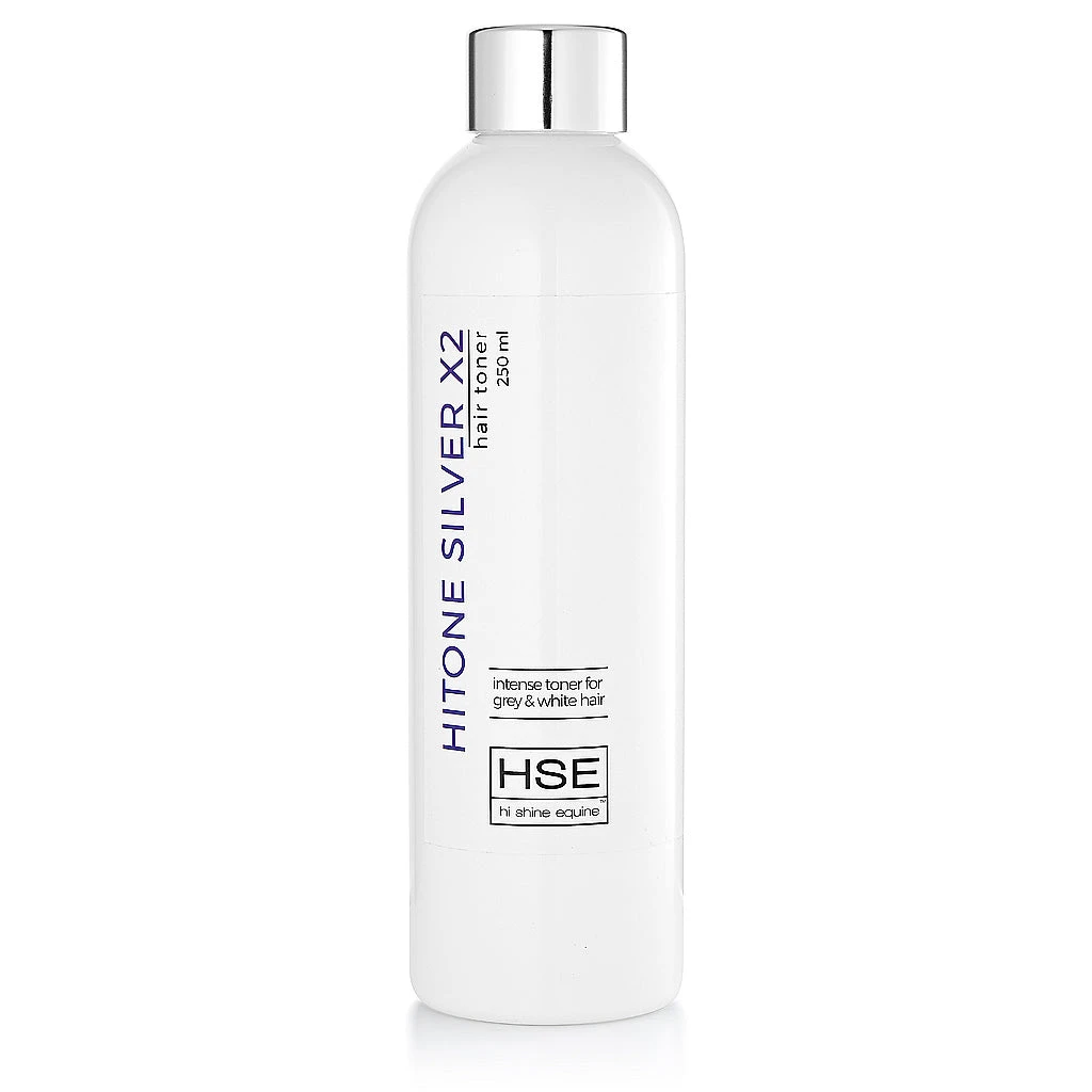 HSE HiTone Silver X2 is a salon formula, ultra-concentrated toning solution for grey & white horses. It is a simple, quick and extremely effective way to neutralise the brassy yellowing left in mane, tail & body hair after washing. HiTone Silver won’t remove grass, manure & urine stains but it will colour correct grey and white hair after shampooing or stain removal leaving the hair ultra-white with sparkling silvery highlights. Regular use will help prevent stains penetrating the hair cuticle.