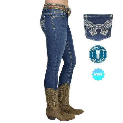 Features: 32” leg, stretch for comfort, mid rise, logo shank button, mock leather logo badge on back waistband, feature back pocket and topstitch detail