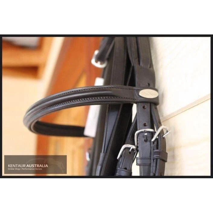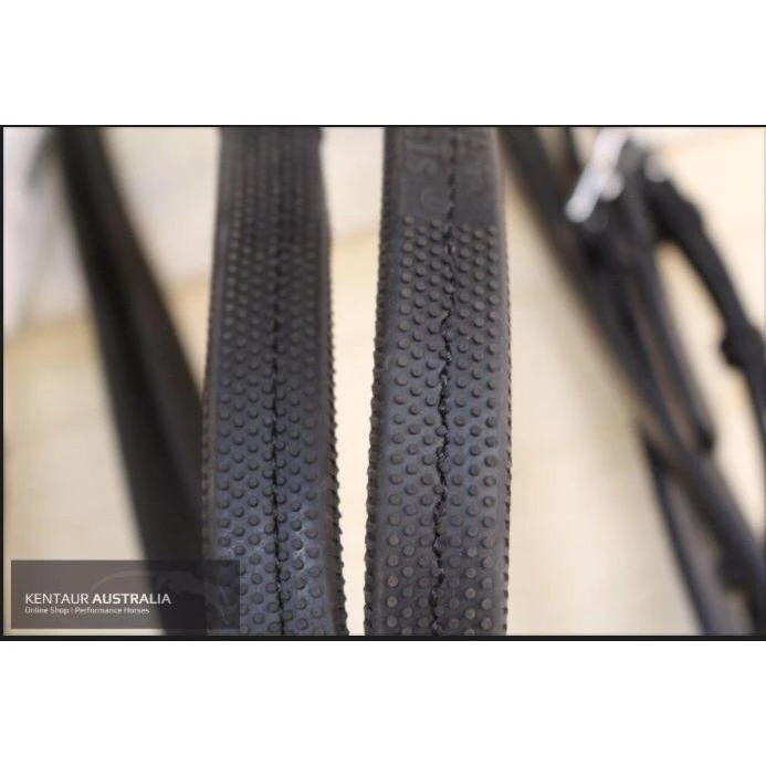 The Kentaur ‘Classic’ Bridle with Rubber Reins is a beautiful leather bridle with a delicate padded noseband. This bridle has a simple yet stunning decoration on the browband, and the Hanoverian noseband is fully removable. A superb piece of craftsmanship, it has been handmade using buttery soft Italian leather. Â