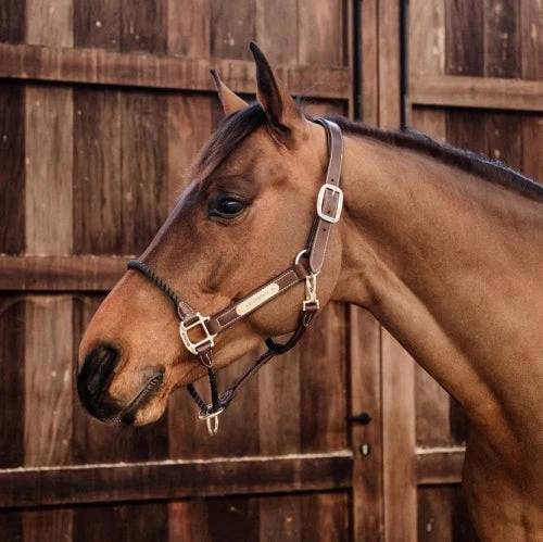 The Leather Rope Halter comes with a thick brown rope to replace the noseband. This rope helps to have more control with horses who tend to have a lot of character. The lower buckle includes a pressure system that will tighten and ensure extra safety if the horse pulls too much. The other pieces of this halter are made of artificial leather that is sustainable, easy to clean and 100% animal friendly. The size can be adjusted on both sides of the head. A carabiner hook on the cheek makes it easy to put the halter on and take it off. All the buckles are gold to match our leads. The halter comes with a name plate with our Kentucky logo that can be returned and engraved.