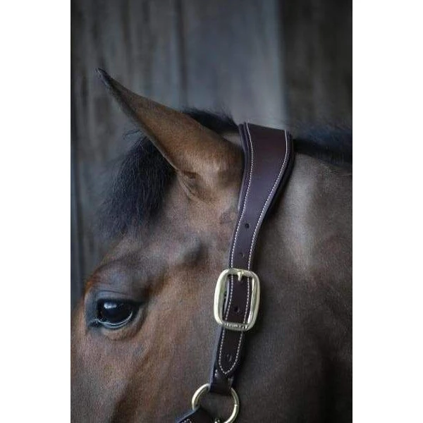 The plate can be flipped over to be able to put your horses name on it. The halter goes back with the horse lead with matching gold closures.