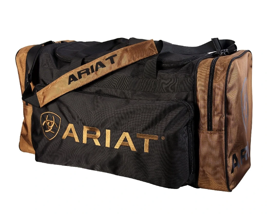 Pockets on both ends, a front pocket with the Ariat logo, a detachable shoulder strap, and a top zip opening to the main compartment.
