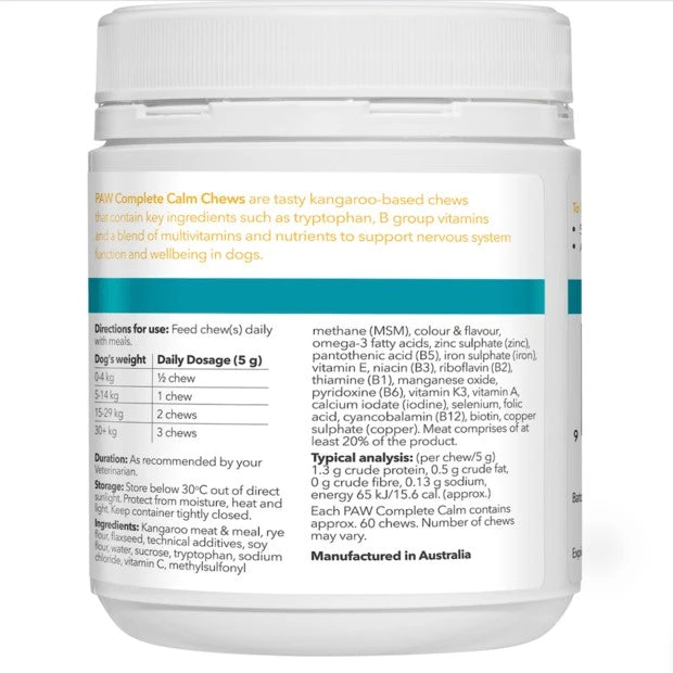 PAW Complete Calm Chews are tasty kangaroo based chews that contain key ingredients such as Tryptophan (180mg per chew), B group vitamins and a blend of multivitamins and nutrients to support the general health and nervous function in dogs.