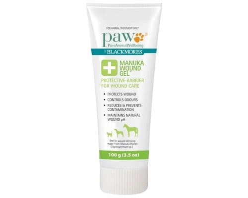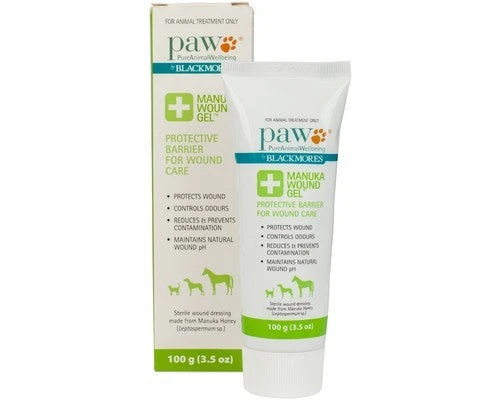 PAW Manuka Wound Gelâ„¢ is a sterile medical grade wound dressing made from Leptospermum.sp (Manuka) honey (80%) and natural oils and waxes for wound management. It is ideal for dogs, cats, horses and other companion animals with wounds, burns, grazes and as a general first aid.